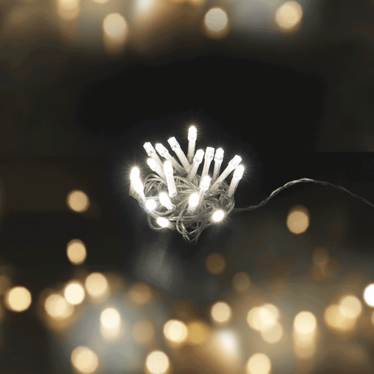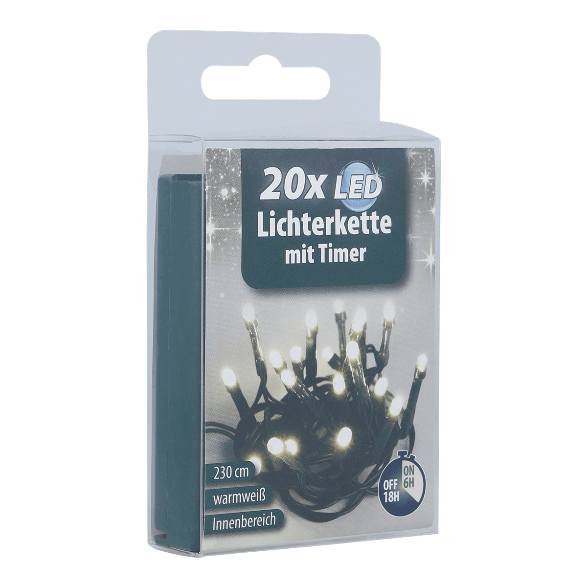 Schaffen Sie eine gemütliche Atmosphäre mit unserer 20er LED-Lichterkette in warmweiß. Mit Timer und in einer 2-farbigen PVC Box präsentiert.