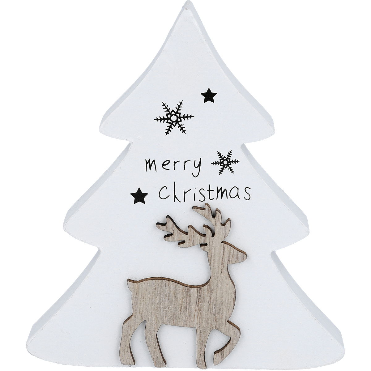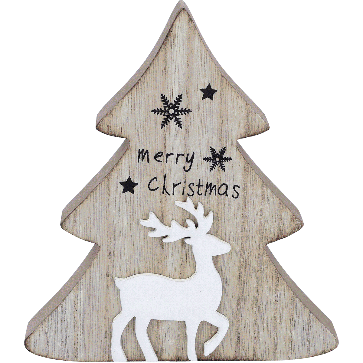 Entdecken Sie den Dekoaufsteller (16x14x2 cm) Tanne mit Hirsch aus Holz. In zwei verschiedenen Farben erhältlich.